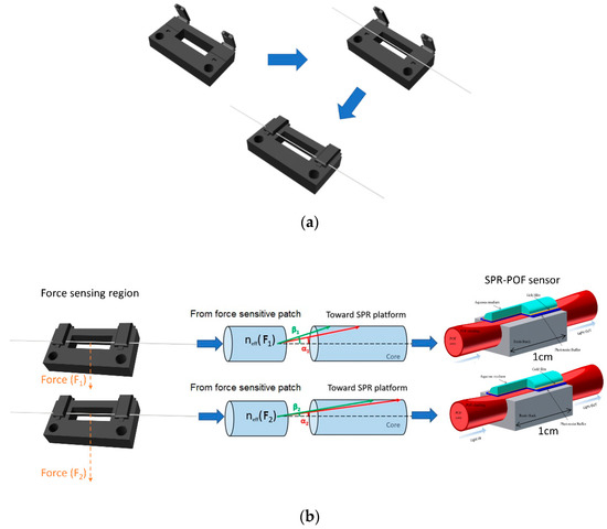 The proposed force sensor system consisted of a POF patch, fixed in a custom 3D-printed holder via two designed clamps to obtain the force sensing region, connected in input to an SPR D-shaped POF sensor. Regarding the connection at their other ends, the patch was connected with a light source, whereas the SPR-POF sensor was connected with a spectrometer. The developed 3D-printed holder used to realize the sensing region and apply the force on the POF is schematically shown in Figure 1a. This custom holder was designed and printed by a 3D printer (Photon Mono X UV Resin SLA 3D Printer, Anycubic®, Shenzhen, China). Figure 1a also shows the steps useful to fix the POF patch in the holder via clamps.