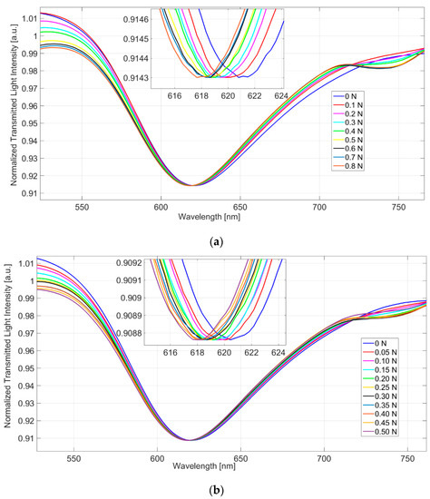 Figure 2 shows the SPR spectra at different applied weights, obtained by a constant water solution (ns = 1.332 RIU) present on the SPR-POF sensor. The SPR spectra reported in Figure 2 were obtained by normalization of the transmitted spectra at different applied forces with a reference spectrum (spectrum acquired when the SPR-POF sensor was in air and no force was applied on the patch). In more detail, Figure 2a shows the SPR spectra obtained by changing the steps of the applied force of 0.1 N, and adding weights of 10 g, in a range from 0 N to 0.8 N. Figure 2b shows the SPR spectra obtained by changing the applied force steps of 0.05 N, adding weights of 5 g in a range from 0 N to 0.5 N.