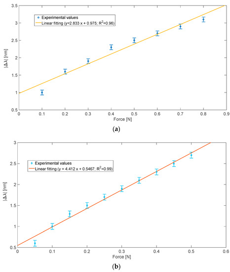 Figure 3 shows the absolute resonance wavelength variation (|Δλ|), calculated with respect to no applied force configuration, for both the results reported in Figure 2. More specifically, Figure 3 shows the results obtained by two different applied force variation steps relative to diverse force ranges, in a similar way to Figure 2.