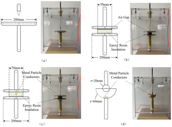 Four types of simulated defects: (a) metal protrusion, (b) air gap between the metal conductor and the insulator, (c) pollution on the insulator surface, and (d) charged metal particles.