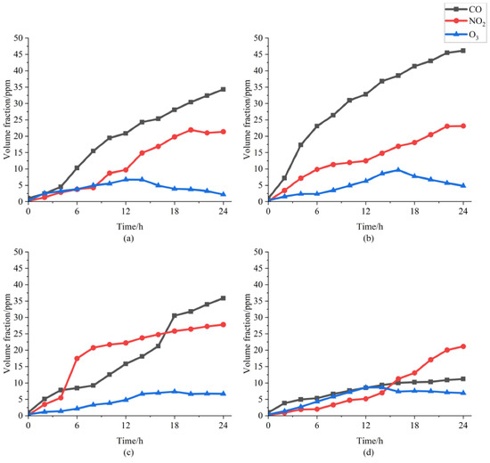 As shown in the upper right corner of Figure 1a, a set of gas circulation systems was designed by using a gas sensor and a couple of gas pumps. Based on electrochemical detection technology, the gas sensor could be operated simply by computer control and had the advantages of fast response, high accuracy, good stability, and repeatability. Critical components in the sensor included the sampling probe, gas sensor, and unit of data processing, storing, and transmitting. Before beginning the experiment, standard gas was used to calibrate the gas sensor to ensure the data reliability. The unit used to measure the gas concentrations was part per million (ppm), meaning the volume fraction of the characteristic gases as a percentage of the air volume in parts per million