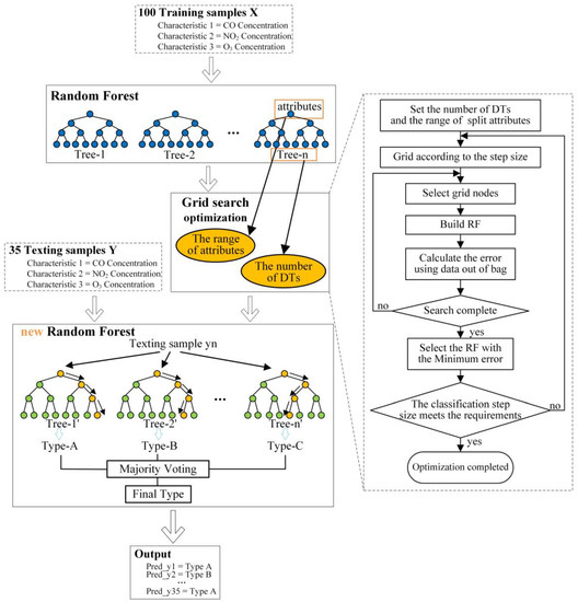 The result of the RF is related to the number of splitting attributes of DT. Grid search was used to optimize the algorithm to find the best DT and candidate attributes. The method was to divide the variable area and traverse all grid points to find the optimal parameter value. Firstly, this paper set the scope and step size of the number of DT and candidate attributes. Then a grid was drawn, whose abscissa was the number of DT and ordinate was the number of candidate attributes. Each node in the grid corresponded to a possible RF. After calculating the value of each node, an RF was built. Then the error was calculated according to the out-of-bag data. Comparing the error and choosing the smallest one, its number of DT and candidate attributes was the best if its error met the requirements. If not, the whole process should be repeated. The framework of the algorithm and the optimization process is shown in Figure 4.