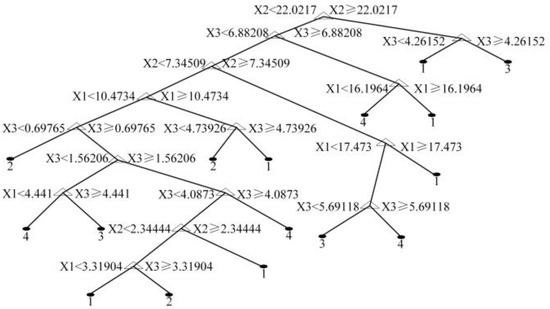 According to the algorithm and optimization process mentioned above, one of the best structures of DT with the minimum Gini impurity is shown in Figure 5. The tree, whose attribute of the root node was , had the most significant increment .