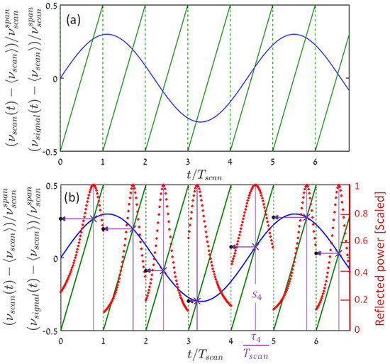 (a) A sinusoidal measurand signal of a normalized temporal frequency of = 0.23 (50 Hz/220 Hz) and filling factor of (solid-blue sinusoidal curve), is scanned by a periodic (every ) saw-tooth waveform (green). (b) The saw-tooth scanning results in a time-dependent detected power (FBG reflection [7,8], or Brillouin probe amplification [11,12,13]: red dot curves (arbitrary units). The purple X’s designate the intersection of the signal with the saw-tooth waveform, also indicating the instants where the detected power reaches it maximum. The black filled circles are the measurand sampled values (the ordinates of the X’s), attributed to the beginning of the corresponding scan periods. Only the middle ~6 scan periods are shown from a simulated temporal range of .