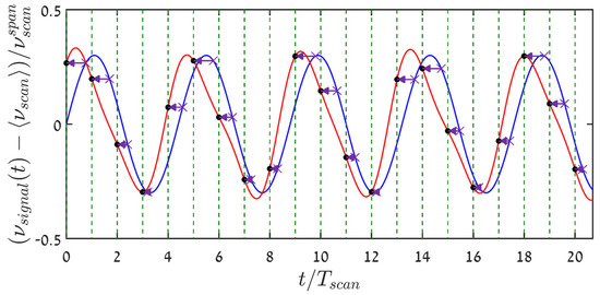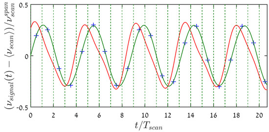 The original sinusoidal signal (blue) of Figure 1, together with its Nyquist–Shannon sinc-reconstruction (red) from the sampled values, , assuming the latter are attributed (see horizontal arrows) to the scans’ starting points (vertical dashed green lines). Shown are the middle ~20 scan periods out of 1100, starting at .