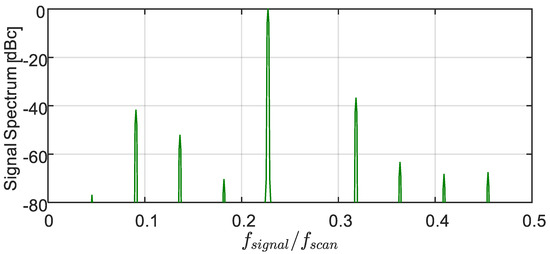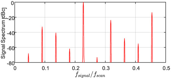 Assigning the sampled measurand values to a uniform temporal grid makes it possible to spectrally analyze them using DFT/FFT (which implicitly attributes these values to a uniform time-grid). Figure 3 shows the power spectrum of the signal of Figure 1, based on its obtained samples values, . Here, the sampling rate is more than twice the Nyquist rate, , and the signal variations are well within the scan limits, . Yet, instead of a single peak at the signal frequency, , the spectrum shows many harmonics, where the one at is a very strong second harmonic, only −13.73 dB below the signal. All other peaks are folded harmonics (e.g., the peak at is the third harmonic at −23.96 dBc, while the one at is the fifth harmonic at −40.69 dBc, etc.). The total harmonic distortion lies at −13.27 dBc. Clearly, the second harmonic is the dominant one. Power leakage to all these harmonics also lowers the peak at the signal frequency by 0.27 dB.