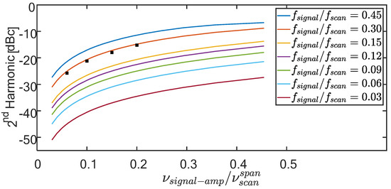 The power (magnitude-squared value) of the second harmonic of an originally pure sinusoidal signal, when acquired from its temporally non-uniform per-period intersections with the linear (instantaneous fly back) saw-tooth scanning waveform of Figure 1. Simulated results are shown for a range of scaled signal frequencies (-legends box) and filling factors ( -abscissa). The higher and/or , the worse the harmonic distortion. The corresponding total harmonic distortion curves lie within half a dB from the displayed second harmonic ones. The black squares represent experimental results for the Brillouin setup of Section 4. Note that a different scan pattern, such as a triangular one, will result in different curves.