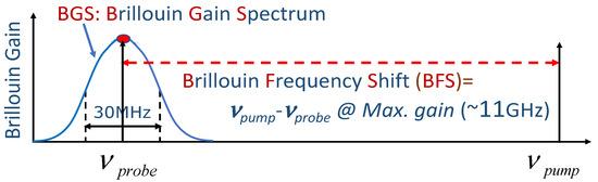 In BOTDA [11,12,13], a pump pulse of optical frequency propagates against a continuous wave (CW) probe of frequency in a standard single-mode optical fiber. Mediated by an acoustic field, induced by these two waves via interference and electrostriction, the pump pulse can amplify the counter-propagating probe through the coherent process of stimulated Brillouin amplification. Brillouin gain experienced by the probe, Figure 7, exists only in a narrowband of frequencies centered at an optical frequency, downshifted from the pump frequency by a characteristic value, , called the Brillouin Frequency Shift (BFS). Its value is around 11 GHz for standard single-mode fibers near 1550 nm. It is the linear dependence of on the local strain (50 MHz/1000 micro strains) and temperature (1 MHz/°C), that makes Brillouin sensing such a useful technique.