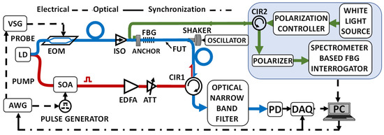 A longitudinally vibrating fiber is interrogated by either an all-polarization-maintaining F-BOTDA setup, producing temporally non-uniform samples, or by a uniformly sampling white-light spectrometer-based interrogator that measures the response of an on-fiber FBG. The of the inscribed FBG is away from the Brillouin scanning region. AWG: Arbitrary Waveform Generator, RF: Radio frequency, SOA: Semiconductor Optical Amplifier/switch, EDFA: Erbium Doped Fiber Amplifier, ISO: Optical isolator, FBG: Fiber Bragg Grating inscribed on the FUT, PD: Photo diode, CIR: Circulator, EOM: Electro-Optic Modulator, LD: Narrowband Laser Diode, DAQ: Data Acquisition, VSG: Vector Signal Generator, ATT: Attenuator.