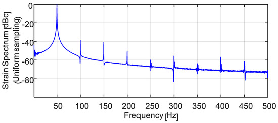 - The easiest and, apparently, also the commonly followed approach: Artificially assign the measured data to a uniform temporal grid, synchronized with the periodic scanning, e.g., the starting or ending points of the scan. The result of treating the data as if they represent uniform sampling appears on the left panels of Figure 10 and Figure 11. The exhibited second harmonic levels are much higher than those present in the actual vibrations, as verified by the much faster and uniformly triggered FBG interrogator, Figure 9. Note that the observed second harmonic levels in these two scenarios (−16.3 and −26 dB, respectively), as well as in a few other scenarios, are in good agreement with the simulation results of Figure 4 (superimposed black squares).