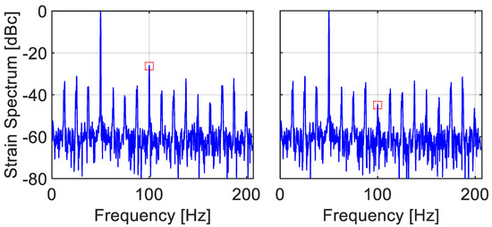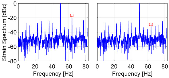 Figure 10 and Figure 11 present FFT-based spectral analysis of the experimentally obtained strain signals under 50 Hz of longitudinal vibrations, using BFS vs. time data, from the middle of the FUT. Two different acquisition conditions are presented in the figures: the case of relatively large values of 0.3 and = 0.16 appear in Figure 10, while the case of lower values of 0.12 and 0.15 is shown in Figure 11. Since our experimental setup is based on frequency scanning, the obtained BFS values are actually measured on a non-uniform temporal grid, . FFT spectral analysis, however, implicitly assumes the data sit on a uniformly spaced one.