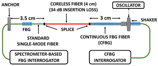 The experimental setup of Figure 12 uses a FUT, comprising a polyimide-coated fused concatenation of three types of fibers: 3 cm of CFBG on its right, 3.5 cm (between the anchor point and left splice) of SMF28 with a single FBG inscribed in its middle on its left, and in-between 4 cm of a coreless fiber, providing optical isolation between the two. This FUT allows simultaneous interrogation from its two sides: from the right with the CFBG interrogator and from its left with the spectrometer-based uniformly triggered interrogator of Section 4. The coreless section, of a measured insertion loss of 34 dB, was verified to prevent mutual interference between the two interrogators. The sampling rates of both interrogators was set to be the same, 100 Hz, measurement time to 10 s and the FUT was sinusoidally vibrated under four different combinations of scaled frequencies (0.1 and 0.2) and scaled amplitudes 0.18 and 0.38).