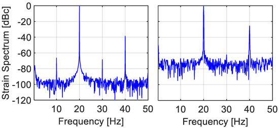 Hamming-weighed FFT spectra of the strain of the vibrating fiber in Figure 12, simultaneously measured by the two interrogators. The scaled vibration frequency and amplitude were and . (Left) Results from the uniformly triggered interrogator of Section 4. (Right) Results from the frequency-scanning CFG interrogator. While its noise level is higher, the peaks at 10 and 30 Hz are still barely seen (these <−60 dB peaks are not folded harmonics, but are rather due to the insufficient spectral purity of the oscillator-shaker combination).