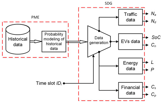 The difficulty of obtaining a large dataset for the scheduling systems for evaluation purposes mandates generating simulation data that is as realistic as possible. To preserve the big picture of the objective of the intended simulator, we need to keep in mind the real-time daily operation of the considered system. This comprises modeling of four different kinds of data, as shown in Figure 2. The proposed simulator consists of two main components: probabilistic model estimator (PME), and the simulation data generator (SDG). In the following subsections, we discuss the details of operation of these two components.