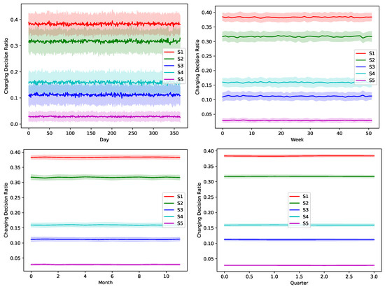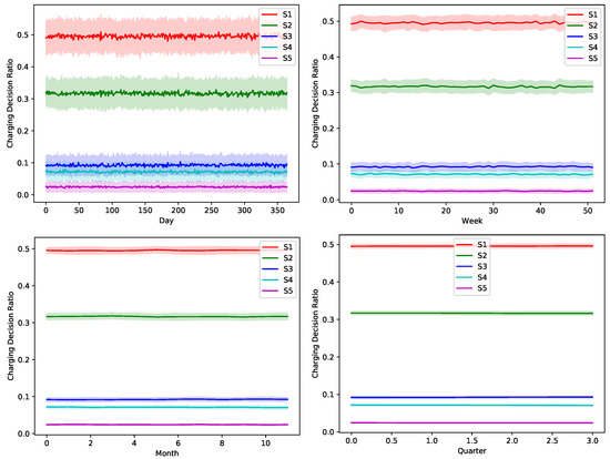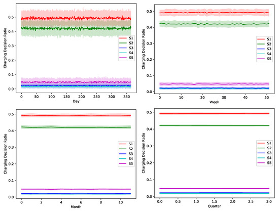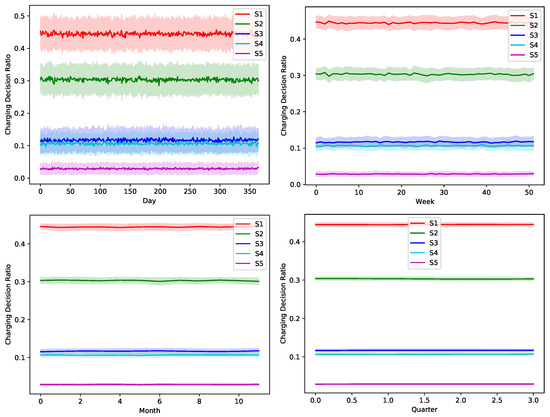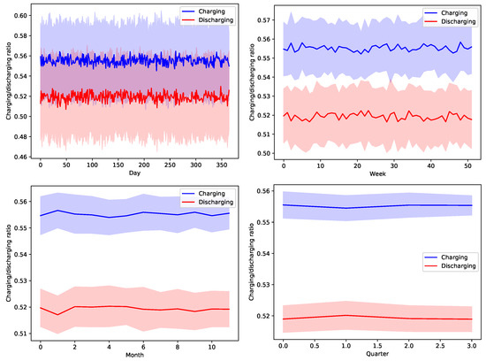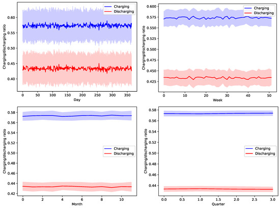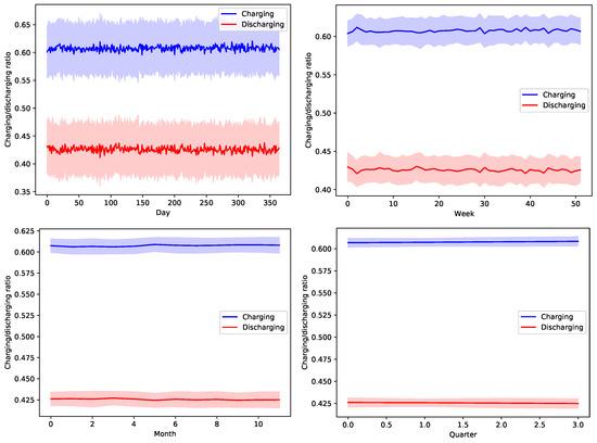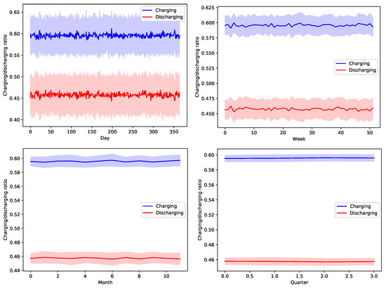 The average temporal charging and discharging ratios of EVs according to the greedy policy with a global certainty level .