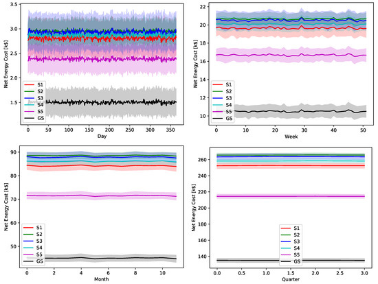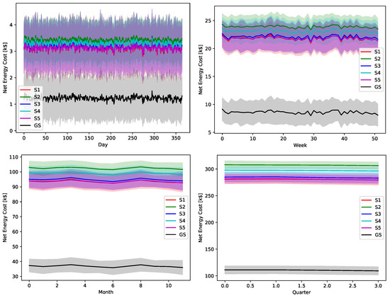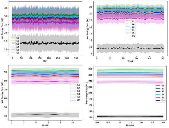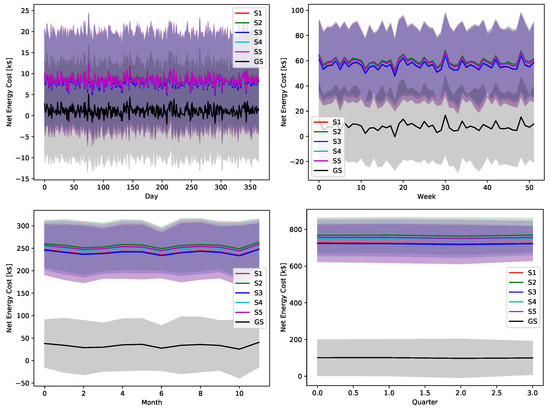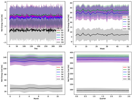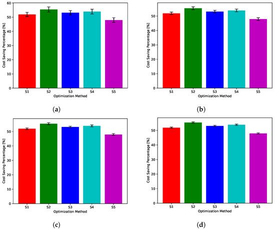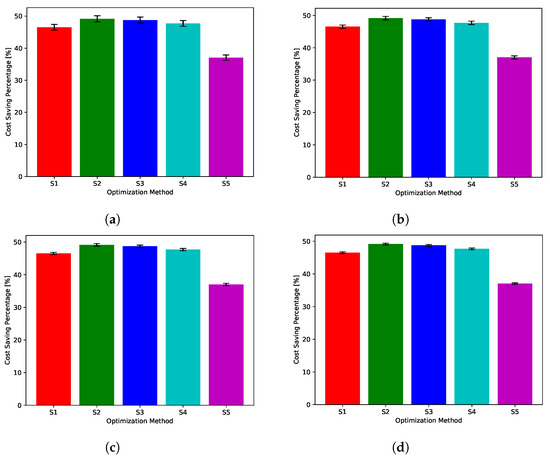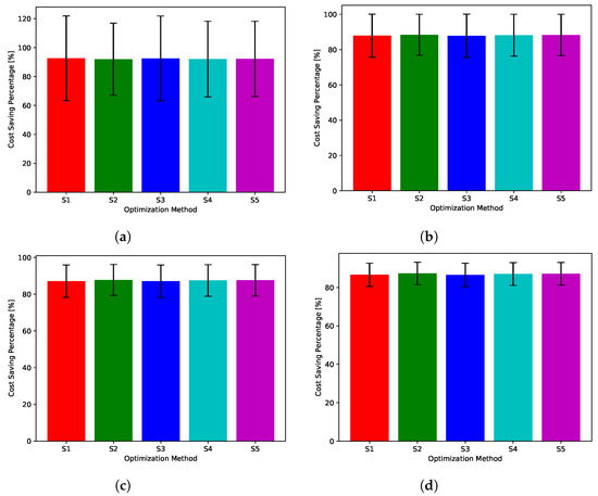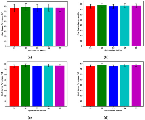 While Figure 18, Figure 19, Figure 20, Figure 21 and Figure 22 show absolute comparisons between energy costs of the considered system with and without the proposed scheduler, there is still a need for some normalized metric that can better express its effectiveness in cost saving. This is achieved by considering a normalized metric, which is calculated as the ratio between the operational costs with a single specific decision and its counterpart when applying the proposed scheduler. Figure 23, Figure 24, Figure 25, Figure 26 and Figure 27 highlight a direct measure of the savings achieved by the proposed greedy scheduler against the cases of adopting every single scheduler from S1–S5 all the time. For the highest uncertainty level, , the greedy scheduler succeeded in saving about 80–85% of system’s energy cost, when calculated monthly, quarterly, semiannually, or annually. These saving values decreases a bit with the increase in the certainty values of the global uncertainty levels; however, the saving is around fifties percent in the least uncertain cases, which is still a considerably high saving achievement.
