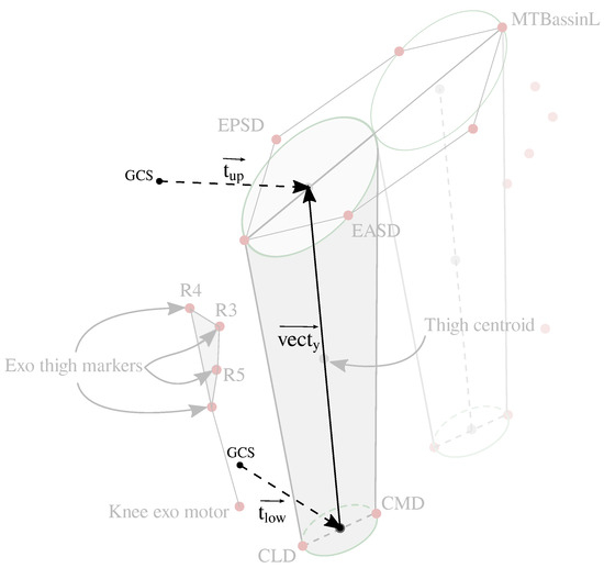 A body’s motion can be described through a local frame that establishes its orientation compared to a global frame located at the origin [30]. In this lower-limb scenario, two bodies are defined through two local frames compared to the global frame. This analysis can be applied to any limb or joint. However, in this scenario, it is implemented in the assisted limb to comprehend the interaction between those bodies. The referenced points are defined through the markers set up and the global coordinate system (GCS), which are used to create multiple vectors (i.e., EPSD marker and the GCS to create the vector). In this sense, the user’s references are established, as is shown in Figure 2.
