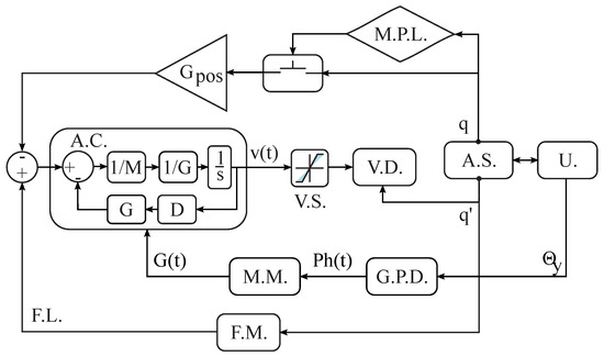 Controller scheme of the assistance mode. The admittance controller’ model is defined as a mass-damper system, including a module of position limitation, velocity saturation, and emergency button. These modules are aimed at the device’s security. (A.C.: Admittance Controller, F.L.: Feedforward Loop, F.M.: Friction Model, M.M.: Modulation Method, G.P.D.: Gait Phase Detection, U.: User, A.S.: Actuation System, V.D.: Velocity Driver, V.S.: Velocity Saturation, P.L.: Position Limitation, M.P.L.: Module of Position Limitation).