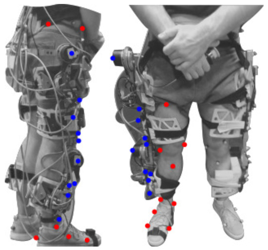 Markers setup used in the pilot study. Highlighted in red are the user’s markers and the exoskeleton’s markers in blue.