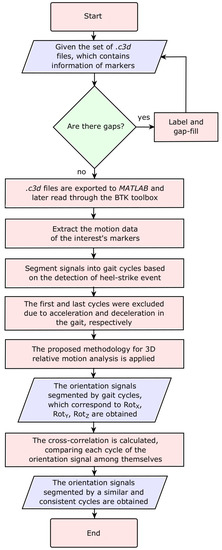 For the first analysis, once the labeling and gap-filling processing (i.e., the gap is understood as a zero value along a specific time span) is done in the NEXUS 2.9 (Vicon Motion Systems, UK) software, the .c3d files are exported to MATLAB (MathWorks, USA) programming environment. These files are read through the free Toolbox Biomechanical ToolKit (BTK) [33], which also allows the extraction of the different signals that describe the positions of the markers of interest.