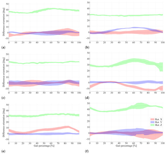 Concerning the , it varies within −5 to 12 and presents an offset close to zero. In this case, the orientation difference is constant for five out of six subjects. For example, while Subjects 1, 3, and 6 show slight scatter behavior, the difference of orientation corresponding to Subject 2 varies in 10 between 18% and 60% of the total percentage of the gait cycle.