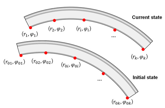RS2: Determine the initial position of scanned points. Here, is the initial radial coordinate of scanned point and is the initial polar coordinate of this (see Figure 2). By the assumption of A2, the initial radial coordinate of all scanned points can be set as designed radius . The initial polar coordinate of scanned point is denoted by Equation (8). The derivation of the equation is based on the discovery that the arc length between each measurement point is proportional during the process of deformation, which is explained in detail in Appendix A.