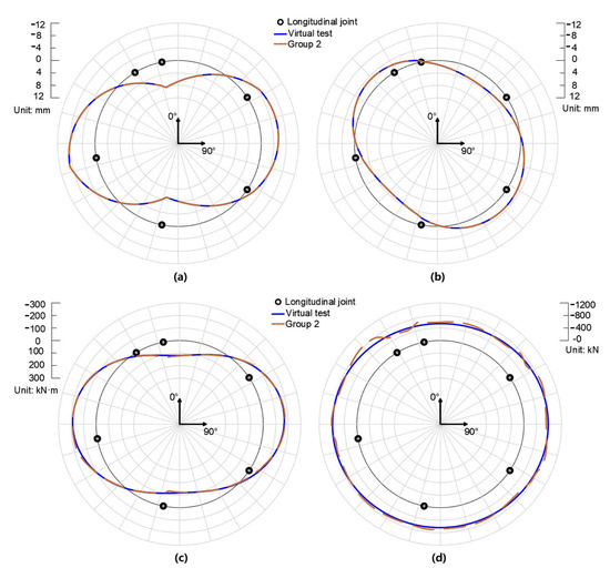 Figure 6a,b show the radial and tangential displacement of the virtual test and Group 2. The results show that although Group 2 takes the deformed profile () of measurement points as input, it reproduces the displacement field of the segmental lining ring to a great extent. The reproduced displacement can be employed for quantifying the internal forces of the segmental lining ring; see Figure 6c,d. Hence, the rationality of remedial solution I is validated.