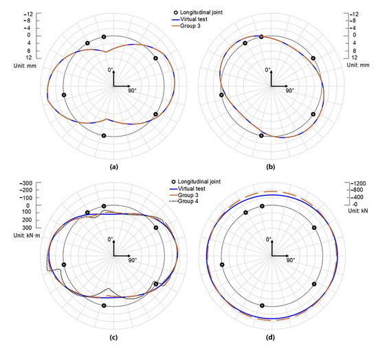 Figure 5a,b show the radial and tangential displacement of the virtual test and Group 1. The former is defined as positive when the ring moves inward. The latter is defined as positive when the ring rotates clockwise. As is shown in Figure 5a, the lining ring deformed to be an oval in terms of radial displacement, moving inwards at the crown and bottom, and expanding outwards at two waists. It is noteworthy that although the radial displacement field is smooth within every segment, the tendency of radial displacement at one side of every longitudinal joint does not always match that at the other side. This is because of the detachment of the neighboring segments (see Figure 5a). As for the tangential displacement, the upper-right and bottom-left part of the lining rotate in a clockwise direction, while the other part of the lining rotates in a counterclockwise direction (see Figure 5b). Unlike the radial displacement, the distribution of tangential displacement is influenced very slightly by the existence of the longitudinal joints. In a word, both the radial and tangential displacement of the hybrid analysis are consistent with those of the virtual test, proving the suitability of interpolation Equations (1) and (2).