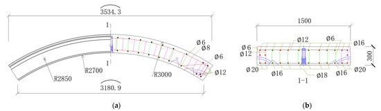 Appendix A seeks to provide a supplementary explanation of the philosophy of remedial solution I and apply Equation (7) in Section 3.2.3. The results of the FEM model in Section 4.1 are employed and segment B2 (see Figure 3) is taken as an example. The segment is divided into 22 arcs, and the change in each arc length is extracted from the numerical model and compared. It could be seen that the change in arc length is rather small compared with the original arc length. The uniformly distributed axial forces compress the segment evenly, changing each neighboring node’s arc length to the same amount of −0.003%; see Table A1.