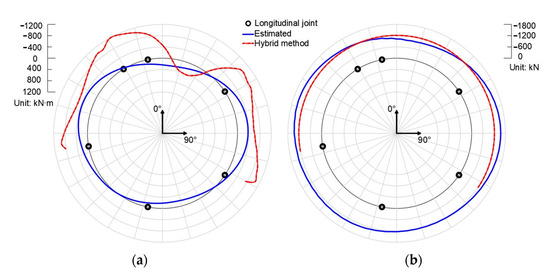 Figure 5c,d show the bending moments and axial forces of the lining ring. The bending moment is defined as positive when the internal surface of the segment is in tensile. The negative axial force means compressive resultant force. In general, the bending moment is positive at the crown and floor, and gradually increases to be negative at the waist (see Figure 5c). The axial forces are visually uniformly distributed along the circumference of the lining, slightly lower at the bottom and crown than those at the waist (see Figure 5d). Furthermore, both the bending moment and axial force quantified by the original hybrid analysis are in good agreement with those of the virtual test. Hence, the rationality of the original hybrid analysis is validated.