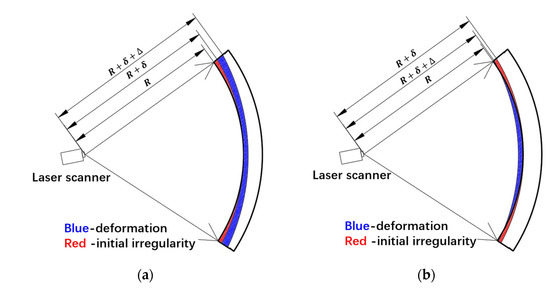 The nomenclature of the equation is explained in Figure A1, where the red dots represent the measurement points and denote the arc length at the initial state, while stand for the arc length of the deformed lining.