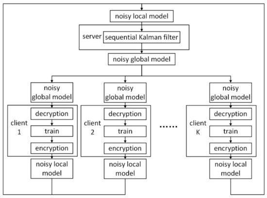 We propose a differential privacy strategy based on local features of non-Gaussian noise and aggregate the metadata from each client with a sequential Kalman filter in the server, which greatly improves the security of the data transmission and allows real-time updates. Once the metadata reach the server, they can be aggregated immediately if the server is in an idle state. As depicted in Figure 1, the proposed method is as follows:
