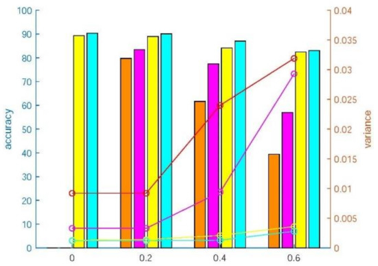 Figure 3. Comparison of the results for the different methods. Dark orange—not-decrypt; magenta—Gaussian decrypt; yellow—NGDP-FedAvg; cyan—NGDP-FedSKF. The line chart represents the variance values and the bar chart represents average accuracy values.