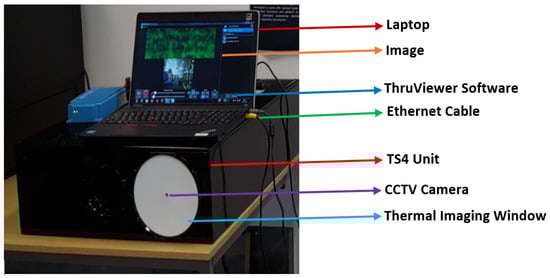 A ThruVision passive imager having a center frequency of 250 GHz and a bandwidth of 36 GHz (type: TS4, manufacturer: Digital Barriers, Abingdon, UK) [49] was used to scan images from the porcine skin samples. The imager is sensitive over the band 232–268 GHz and has a primary lens diameter of 175 mm and a measured depth of field of 200 mm (the span of range over which an object remains in focus). The imager has an operating wavelength of 1.2 mm and a spatial resolution of 5.5 mm, as summarized in Table 1. The imager consists of a TS4 unit and a laptop, as illustrated in Figure 2. The imager requires around 10 min of warm-up time. The TS4 unit is connected through an Ethernet cable to a laptop and the data are transferred from the TS4 unit to the laptop and vice versa. The images were displayed on the screen of the laptop using ThruViewer software version 7.2, and they were saved in screenshot format to be processed later using the Matlab program.