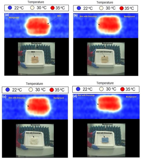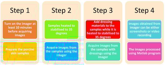 In the case of skin with dressing materials, a similar methodology was applied to the sample. However, the dressing materials were located over the sample when the sample was located over the digital hotplate. This means that the temperature of the sample was stabilized to 35 °C with the presence of different types of dressing materials. This minimized the variation in the temperature of the skin as a result of adding extra dressing material layers. Figure 4 summarizes the methodology applied on porcine skin samples to obtain images for the skin with and without the presence of dressing materials.