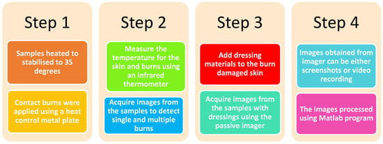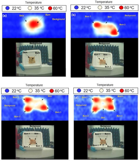 Images for porcine skin samples with single and multiple burns were performed using methodology 2 described in Section 2.3.2. The measurements were applied on two samples; sample 1 (length = 160 mm and width = 110 mm) and sample 2 (length = 110 mm and width = 100 mm). Images were obtained at a room temperature of ~22 °C and they were processed using the Matlab program, as illustrated in Figure 8.