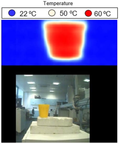 The measurements presented in this section aim to identify the right match between the temperature measurements and the colors in the image. Therefore, a cup of hot water having a temperature of ~70 °C was located over a distance of 800 mm from the passive imager at an ambient temperature of ~22 °C as illustrated in Figure 6. The obtained image in Figure 6 shows the water (hot object) in red color and the background (ambient) in blue color and the plastic cup (which represents the point of contact to the environment) in light yellow color. Therefore, it is reasonable to assume that the lower color in the temperature bar represents the lower temperature (blue) and the higher color in the temperature bar (red) represents the higher temperature.