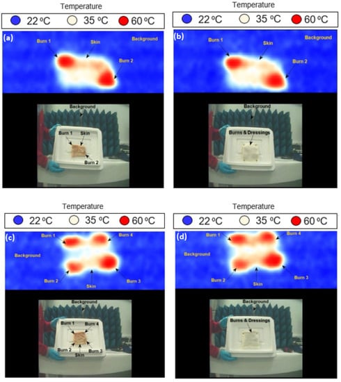 Images for porcine skin samples with burns and dressing materials were performed using methodology 2 described in Section 2.3.2. The measurements were applied on two samples having multiple burns. Images were obtained at a room temperature of ~22 °C before and after the dressing materials were placed on the sample, as shown in Figure 9.