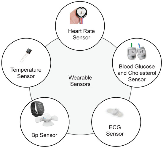 This section presents an IoT and cloud-based proposed healthcare framework for Heart Failure Patients. The architecture of the proposed smart healthcare system is presented in Figure 1. This framework is designed to facilitate medical professionals in monitoring patients’ health using IoT-based devices. Medical staff can access medical records of heart failure patients any time and anywhere using IoT and cloud-based technologies. To monitor the healthcare condition of heart patients, sensors are used to monitor Heart Rate (HR), Blood Pressure (BP), Temperature, Blood Glucose and Cholesterol and Electrocardiogram signals (ECG) [45]. The parameters provide help in monitoring general health status of the heart patients. Smart wearables and fixed sensors enable transmitting patient data and update it using IoT as shown in Figure 2. Sensors are easy to handle for elderly and weak patients. The selection of devices is based on the hospital and care center facility. The proposed framework analyzes real-time information of the patients and helps patients to get medical emergency services in a short time. Patient-related records are uploaded on the cloud, therefore, it is available for the medical staff remotely and they can provide advice according to the state of the patient.