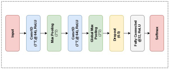 As another deep learning model, CNN is implemented for performance evaluation. The CNN architecture design utilized in the experiment of this study is presented in Figure 3. The proposed CNN architecture consists of total 8 layers, 2 convolutional layers, dropout value, 2 max-pooling layers and 2 dense layers as presented in Figure 4. The Rectified Linear Unit (ReLU) is utilized as an activation function with CNN. Hyper parameters of the proposed CNN model are presented in Table 3.