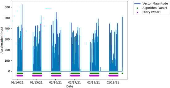 Plot showing a high level of agreement between algorithm and diary measured wear and non-wear, aligned with the vector magnitude from the raw accelerometer data.