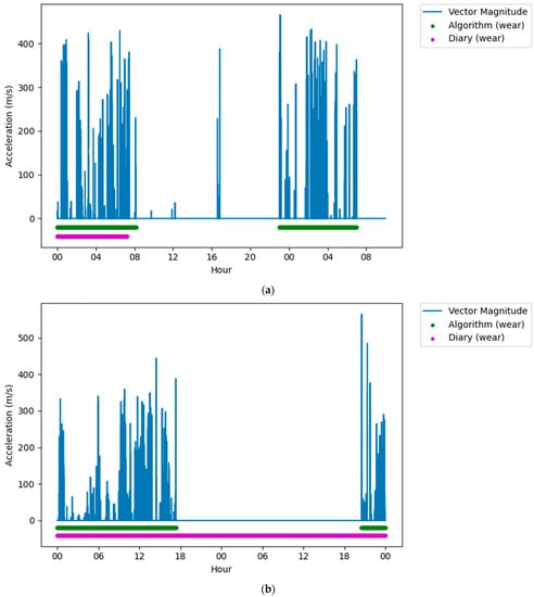 Following classification, it was clear that on some days there were large differences (over five hours) between the reported wear time and the algorithm measured wear time. When visually assessing this data against the accelerometers’ vector magnitude signal, there were several periods where there was movement or lack of movement that was incorrectly reported in the diaries. Often these were near the end of that participant’s data collection, and it was assumed that the participant had failed to report these in the diary, thinking that the data collection period had ended (Figure 3a). Similarly, there were very long (>5 h) non-wear periods that were not reported in the middle of the data collection but were both very long (>5 h), and there was no movement in this period (Figure 3b). Finally, there were periods that were reported as non-wear, but there was clear, prolonged (>5 h) movement in the raw signal (Figure 3c). For these conditions, the data were removed from the dataset to ensure that issues in reporting did not affect the analysis.