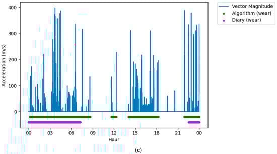 Figures showing issues with self-reported measures that were removed from the dataset. (a) Plot showing a long wear period not reported in the diary, but detected by the algorithm, near the end of the data collection period. (b) Plot showing a long non-wear period not reported in the diary, but detected by the algorithm, in the middle of a data collection period. (c) Plot showing a long wear period not reported in the diary, but detected by the algorithm, in the middle of a data collection period.