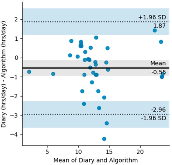 A total of 45 days were used to create the Bland Altman plots (Figure 4). The Bland Altman plot quantifies the bias and the range of agreement within which 95% of the differences between self-reported and algorithm wear lie. The plot shows a −0.55 h in the diary measurements and limits of agreement ranging from −2.96 h to 1.96 h. Most of the differences between the reported and the measured wear time come from the differences in exact reporting times. However, there are a few outliers longer than two hours, resulting from the algorithm measuring daily wear more than what was reported. During these periods there is clear movement displayed from the accelerometer and they are either the result of miss-reporting or movement of the device that is not related to wear such as transportation.