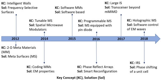 A summary of the historical perspective can be observed in Table 1 and Figure 2. Intelligent walls (IW), based on frequency selective surfaces (FSS), can alter the propagation direction, environment and performance of the electromagnetic (EM) waves through switching [48,49]. Subsequently, 2D metamaterials were designed to be an alternative to FSS for operation at various frequencies [33]. In [33], the authors outlined several use cases of 2D metasurfaces and discussed the ability of wave guides to trap and guide EM energy between two metasurfaces as well as the ability of terahertz devices to control metasurfaces to benefit operation at terahertz frequency. The benefits and applications in wireless communication of 2D metasurfaces, which occupy less physical space and experience lower loss when compared with three-dimensional (3D) surfaces, were also highlighted along with the operation at different frequency bands. Tunable metasurface-based spatial microwave modulators (SMM) were implemented by placing the SMM on the walls for maximizing the power or range of the transmission signal [50]. More recently, coding metamaterials (MM)s with the ability to manipulate the EM properties, replacing the phases 0 and with a binary 0 and 1 [51] was introduced. This further helped in implementing the software program defined metamaterials as mentioned in [52]. Furthermore, programmable metasurface based on a PIN diode was introduced in [53] and references therein. Finally, in 2016 reconfigurable reflect arrays with passive elements were introduced, [54] and a large intelligent surface was proposed as a concept for beyond mMIMO [55,56,57]. In [58], the authors discussed backscatter principles and communication and reflective relay and introduced a large intelligent surface antenna (LISA). A software controlled hype-surface for IoT devices and for non-line-of-sight (NLoS) indoor communication was presented in [59,60]. Intelligent reflecting surface-based phase shifting of reflecting elements to steer the EM direction was proposed in [61].