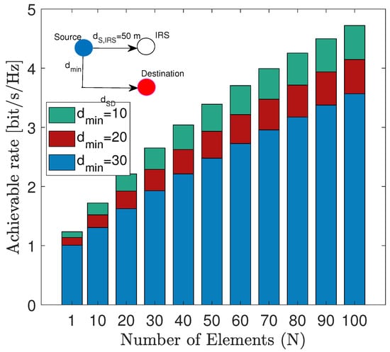 where is transmit power, , , is amplitude of reflection associated with the IRS and is noise variance. Furthermore, let us assume that the LoS and NLoS propogation follows as articulated in [69], then Figure 5 shows the achievable rate against minimum vertical separation between the IRS source and the destination. As shown in Figure 5 the throughput decreases with an increase in separation as the path loss increases with the distance. Moreover, the throughput increases with an increase in the number of elements as expected. The interesting insight here is that the decrease with distance is more pronounced when N is small. This implies that perhaps an adaptive selection of N which depends on the distance between source and destination should be employed. As a matter of fact, such distance dependent adaptations are common features of current wireless networking standards. In particular, distance dependent adaptive rate selection is part of most 802.11x standards. Therefore, it is plausible to explore distance dependent activation of N to realize a similar rate adaptation technique for IRS empowered future wireless networks.