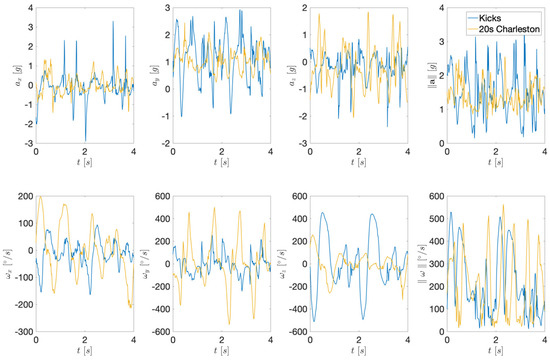 Figure 2 shows the acquired acceleration and angular velocity signals for two illustrative template moves: (3) Kicks and (7) 20s Charleston. The first row depicts the acceleration signals, while the second row shows the angular velocities. Even from pure visual inspection, we can see that both the 3D projections and magnitudes have distinctive signal shapes. It is therefore reasonable to assume that these signal shapes can be used as fingerprints enabling dance move recognition.