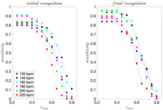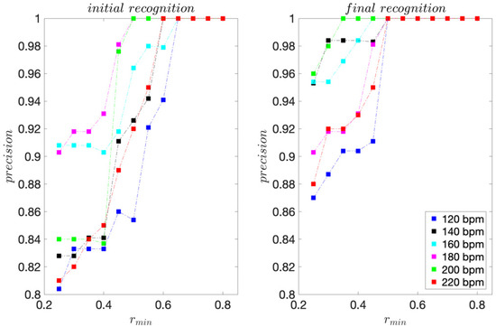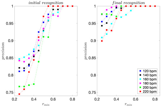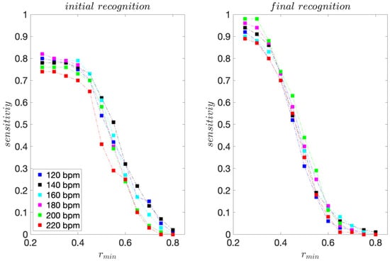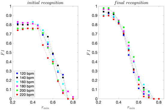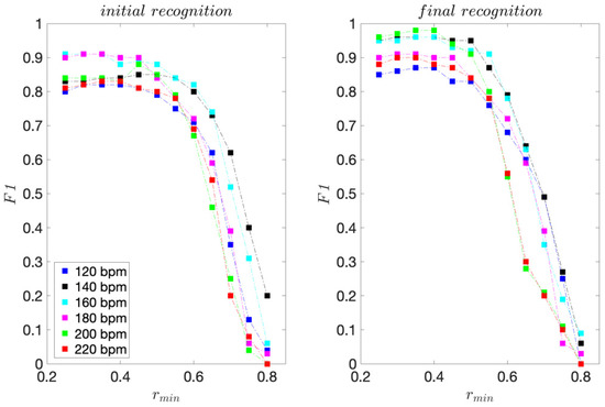 The presented recognition method is non-binary and we assess its recognition ability by considering each move that is correctly recognised as a true positive (TP). Each move that is incorrectly recognised we consider as a false positive (FP). Using cumulative TP and FP rates for all I = 15 moves, we calculate the sensitivity and precision scores for each dance tempo considered. We calculate these scores for threshold values rmin ranging from 0.25 to 0.80 with 0.05 increment steps. We finally use the F1 score, calculated from sensitivity and precision, as the unified measure of recognition ability.