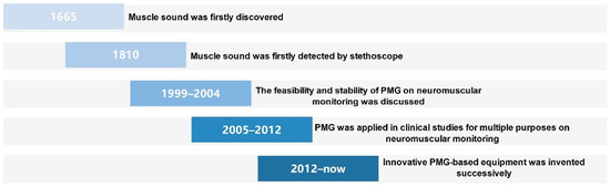 Although PMG has been extensively discussed in the study of muscle contraction [36], myopathies [37], muscle fatigue [38], muscle pain [37] and prosthesis control [39,40], this technique is still poorly understood in the neuromuscular monitoring domain. Previous studies have already unveiled part of its properties when considering this technique as a method to detect the depth of neuromuscular block. The history of PMG-based equipment can be roughly divided into two categories (Figure 2): (1). Theoretical derivation and early exploration; (2). Applied research and technique renovation.