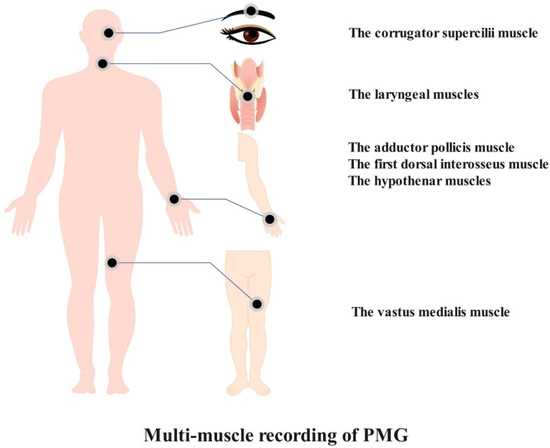 The characteristics of PMG have embodied its advantages. The preponderance of PMG lies with its features of convenience and multimuscle recording (Figure 3). We speculate that PMG may possess some merits that would compensate for defects that belong to those extant neuromuscular monitoring methods and that may bridge the current technology gap. However, it remains to be determined whether PMG is truly a superior method due to the lack of related study. The properties of PMG in perioperative neuromuscular monitoring are as follows: (1) PMG-based equipment is easy to install and apply; (2) PMG-based equipment may present a stable signal that is barely affected by outside factors owing to its low frequency quality; and (3) PMG-based equipment is able to assess neuromuscular monitoring at the adductor pollicis muscle, corrugator supercilii muscle, vastus medialis muscle, first dorsal interosseus muscle, hypothenar muscles, and laryngeal muscles.